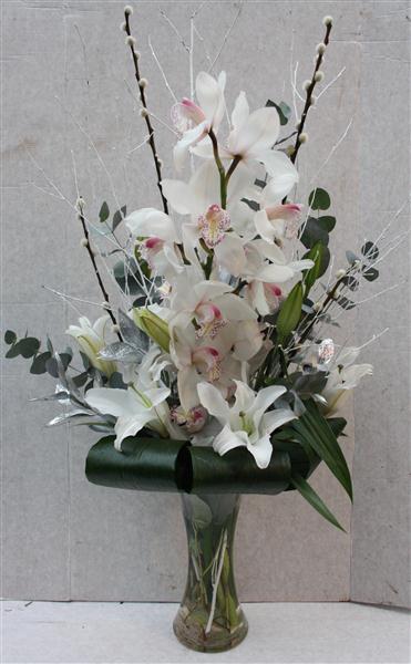 A stunning front facing vase arrangement that shows of the luxury of a large white orchid, scented white oriental lillies and pussy willow. Finished with silver eucalyptus and folded aspadistra leaves.