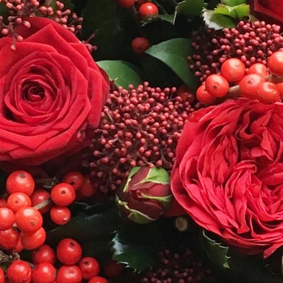 A luxurious hand tied bouquet that includes 12 Red Naomi roses, Red Piano Roses, Ilex Berries and finished with red Skimmia.