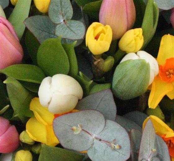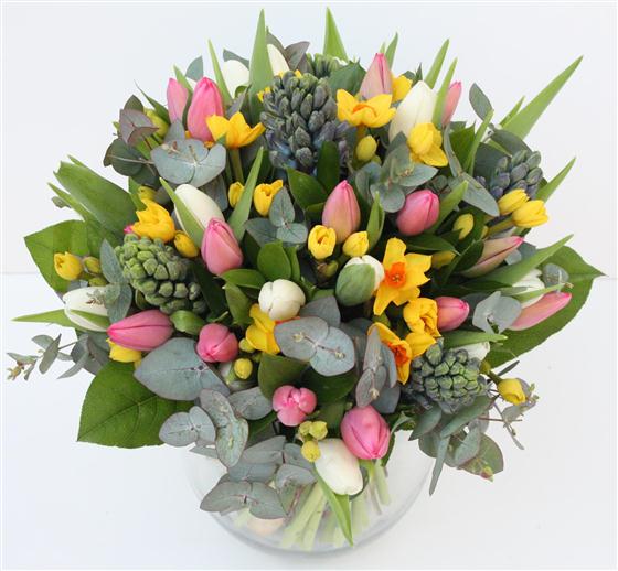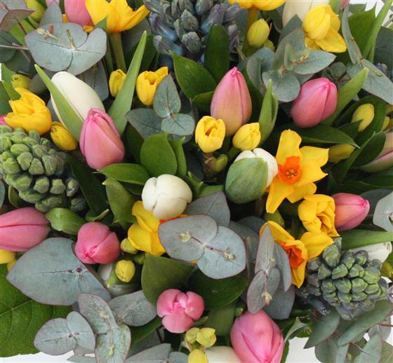 This is our special offer for Mothers Day. This bouquet includes pink tulips, white tulips, blue hyacinths and narcissis, finished with eucalyptus.